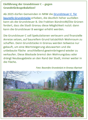 Außerdem fordern wir die Einführung der neuen Grundsteuer C , zur Verhinderung von Grundstücksspekulation und zur Förderung von Wohnungsbau! Die Grundsteuerreform macht das ab 2025 möglich (siehe Kasten zur Grundsteuer C).